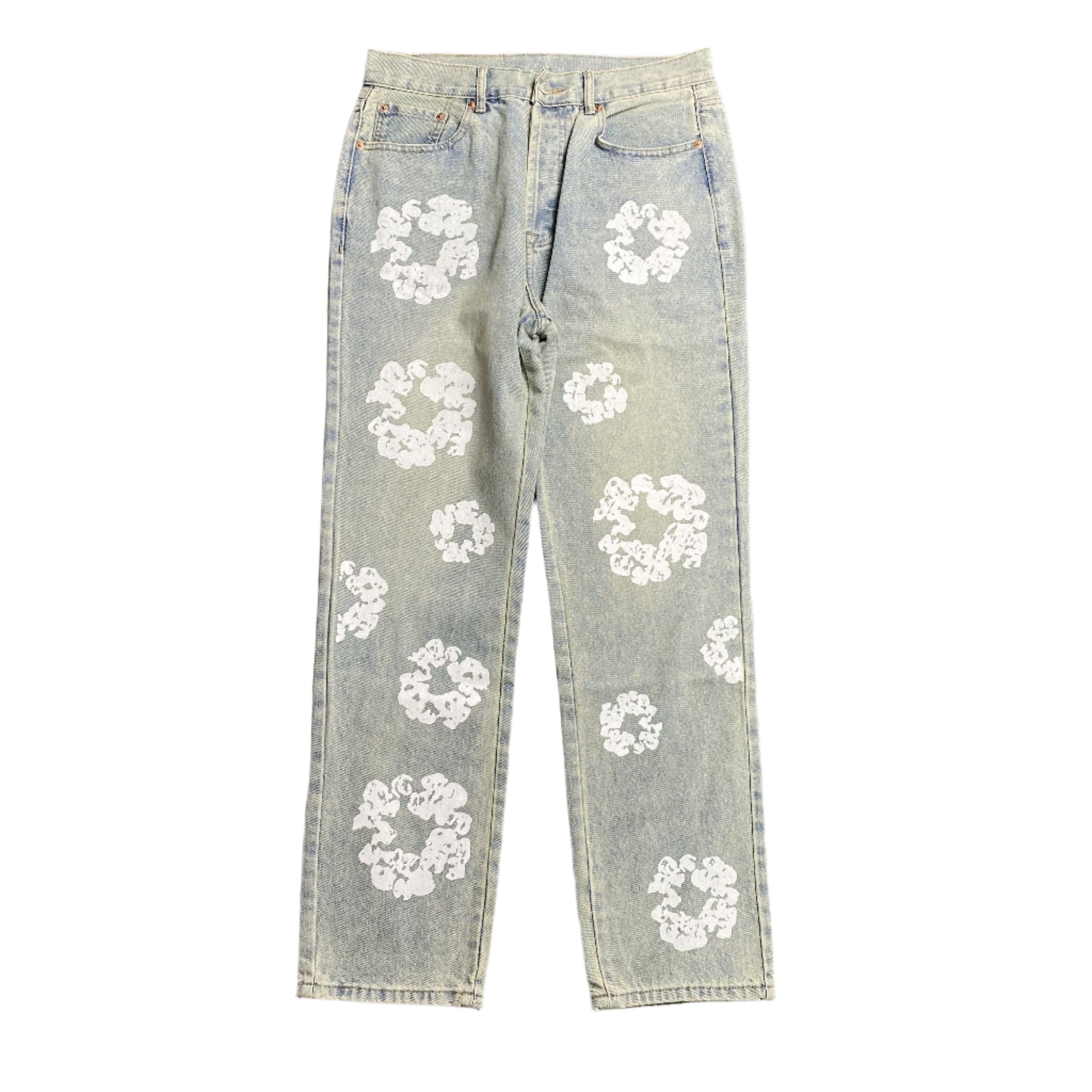 The Denim Tears x Levi's Dirty Wash Wreath Jeans Light Wash bring together iconic design and cultural storytelling in a bold, stylish package. Inspired by the originals, these jeans feature the signature cotton wreath motif, a powerful symbol of heritage and history, beautifully contrasted against a sleek black denim base. Crafted with a premium denim blend, they offer a relaxed yet flattering fit, combining durability with comfort. Perfect for making a statement, these jeans embody the essence of modern streetwear and artistic expression at an accessible price. Redefine your style with a piece that speaks to culture and individuality.