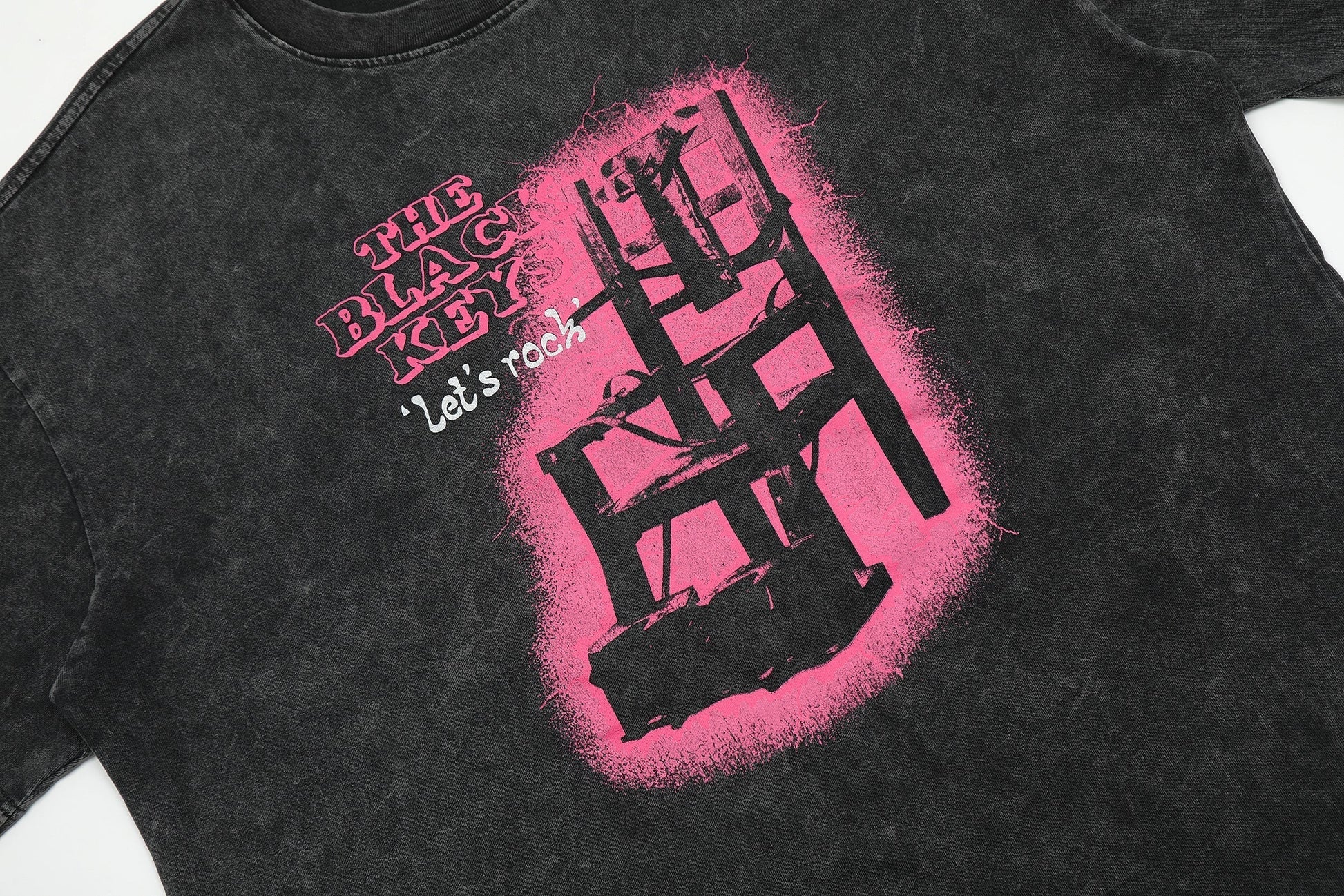 The front of the tee features a striking graphic of stacked amplifiers with a vibrant pink background, emblazoned with the words "THE BLACK KEY" and "Let's rock" in a distressed, graffiti-style font. This eye-catching design captures the rebellious spirit of rock 'n' roll, making it perfect for those who want to make a statement.