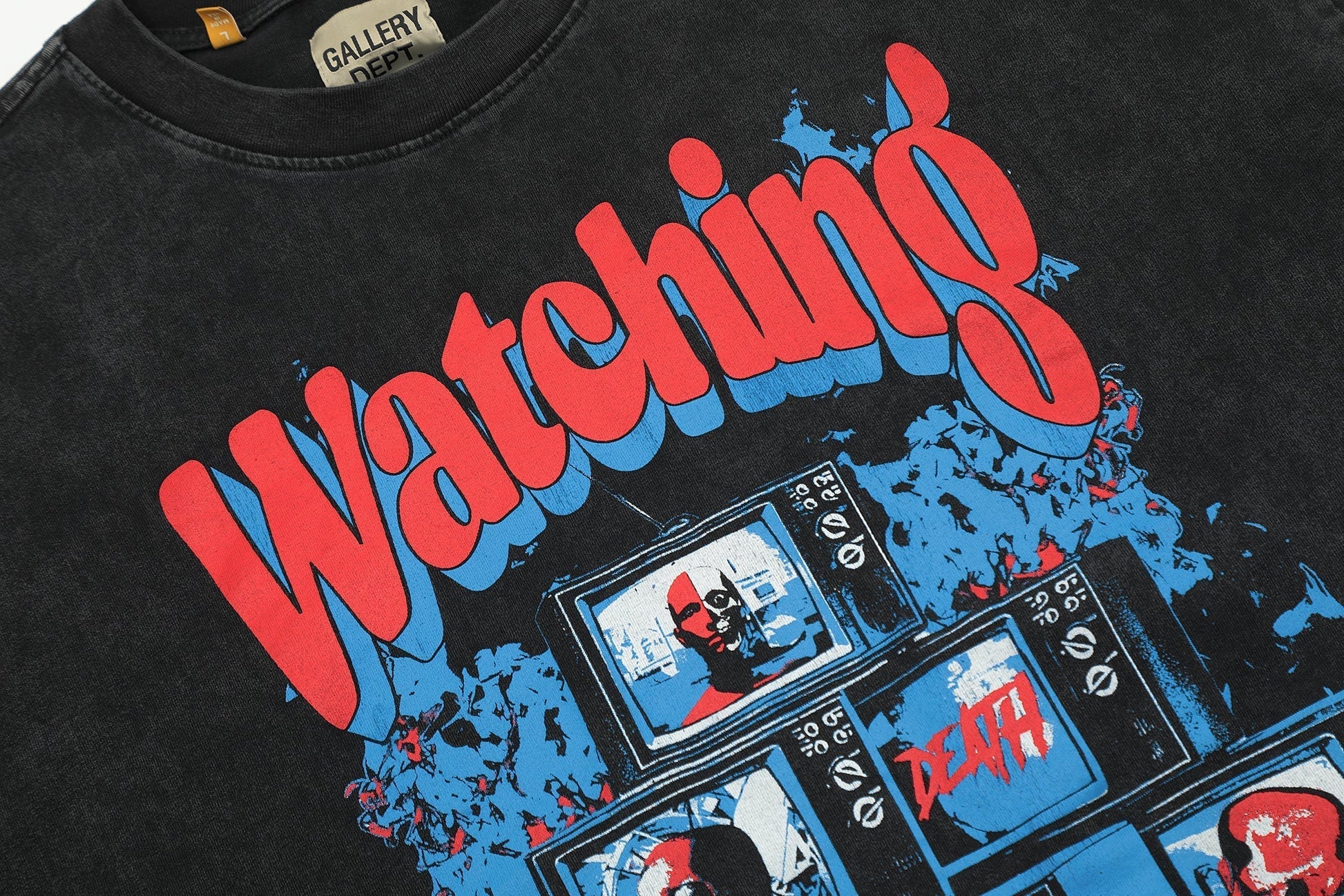 The front of the t-shirt features an eye-catching graphic design. The artwork showcases a stack of vintage televisions, each displaying different images, creating a sense of nostalgia. The vivid blue background splashes add depth and intensity to the design. Dominating the top of the graphic is the word "Watching" in bold red, capturing attention and evoking curiosity.