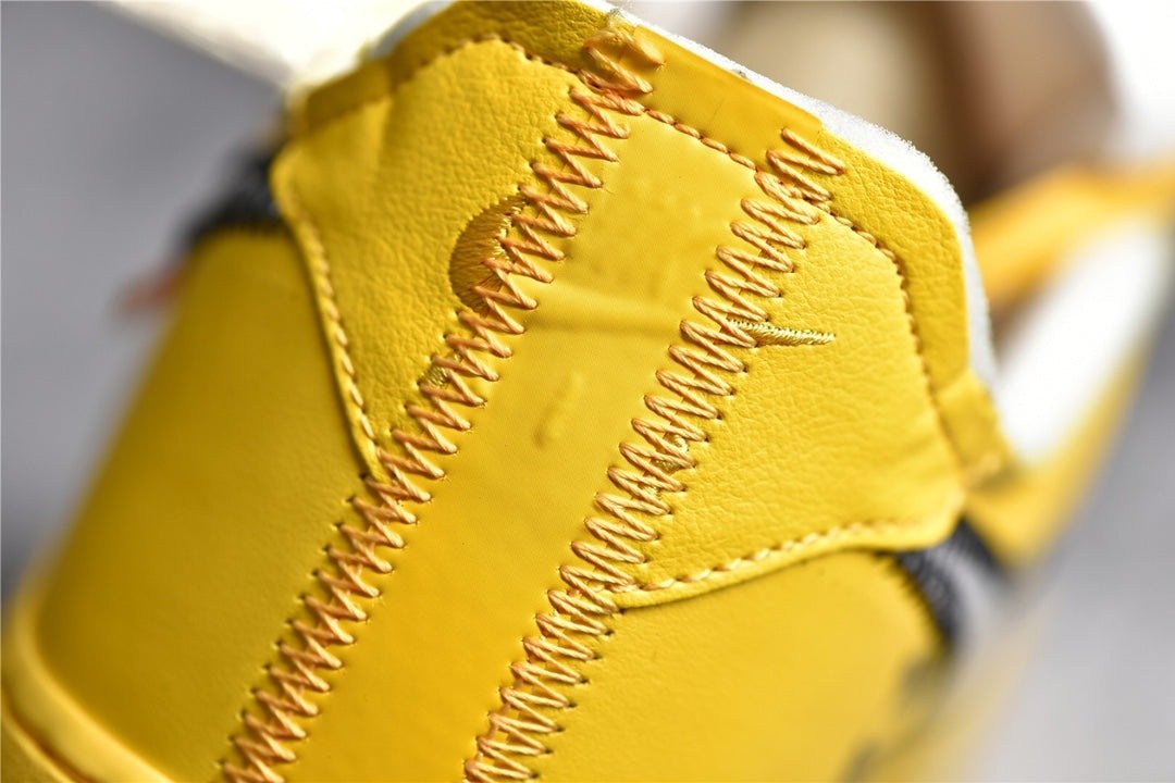 The Nike Air Force 1 x Off-White ICA University Gold showcases a striking design with a vibrant color palette. The premium leather upper features a captivating University Gold hue, adding a touch of luxury and sophistication. Off-White's iconic deconstructed aesthetic is evident with exposed stitching, text overlays, and the signature zip-tie tag, which adds an urban edge to the shoe.